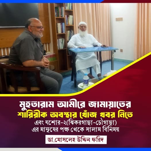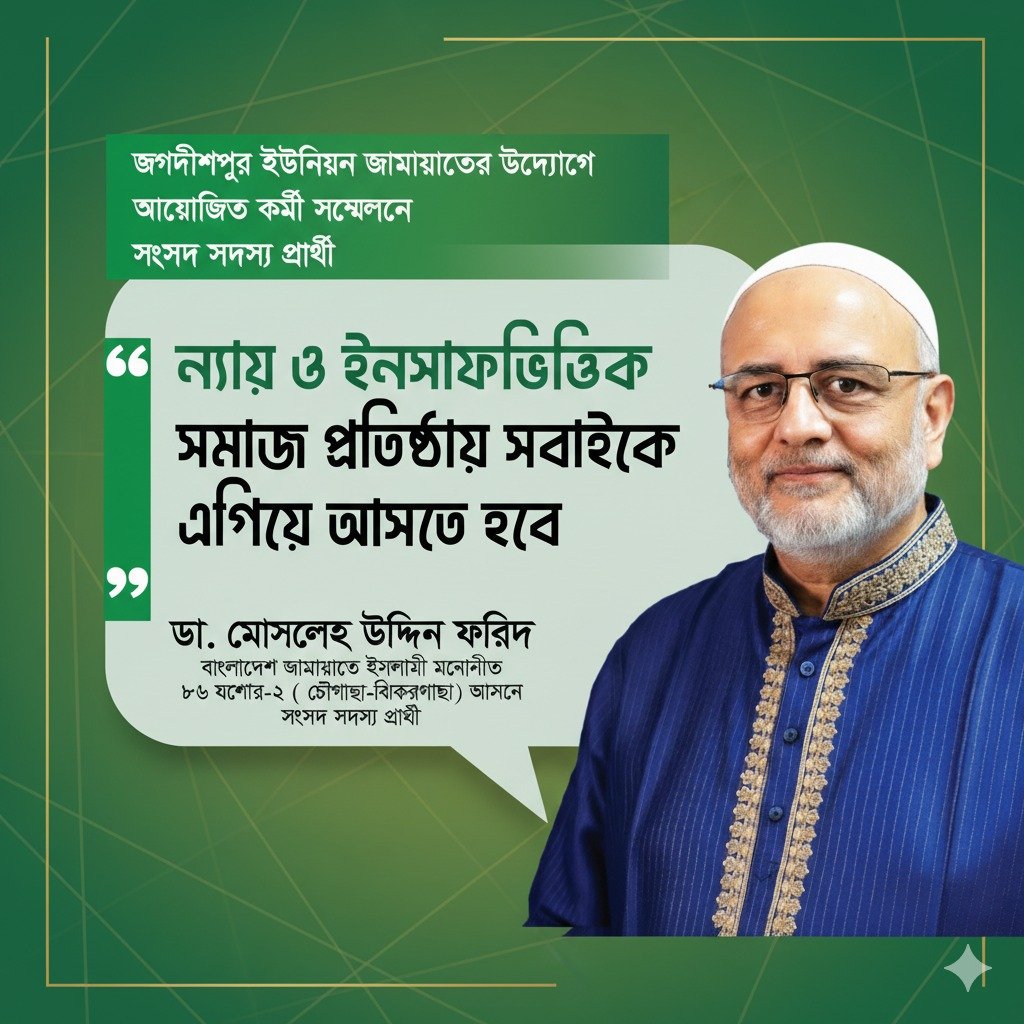 আসন্ন জাতীয় সংসদ নির্বাচন যশোর-২ (চৌগাছা-ঝিকরগাছা) আসনে সংসদ সদস্য প্রার্থীকে দাঁড়িপাল্লা’ প্রতীকে আপনার মূল্যবান ভোট দিন।আসুন, ন্যায়বিচার ও সুশাসনের পক্ষে ঐক্যবদ্ধ হই।